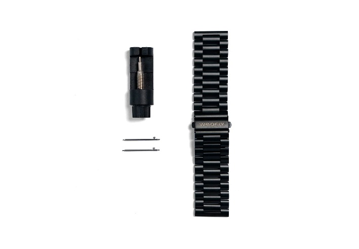 سوار ساعة أسود اللون، معدني.